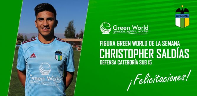¡Nuestra Figura Green World de la semana es Christopher Saldías! Este destacado jugador es parte de nuestra categoría Sub 15 pero también ha defendido la Sub 16 celeste. Saldías llegó a nuestro club en la Sub 9, es oriundo de Olivar y puede jugar de defensa central así como también de volante de contención, mostrando siempre su buena técnica y personalidad en el terreno de juego. Dando un año de ventaja, Christopher Saldías forma parte de la Selección Chilena Sub 17 que se prepara para el Sudamericano del 2019, sumando valiosos minutos frente a Uruguay el reciente fin de semana.
